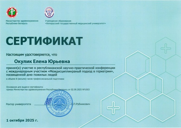 Психолог ГУ «ЦСОН Кореличского района» приняла участие в Международной республиканской конференции «Междисциплинарный подход в гериатрии», которая прошла в Международный день пожилых людей на базе института повышения квалификации и переподготовки кадров здравоохранения БГМУ г. Минска.